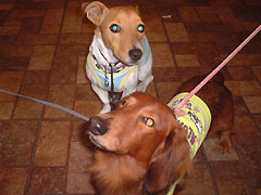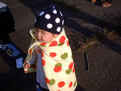 こたろう「えっと、今日のファッションポイントは きのこの帽子でちゅ。」 ママ「こたちゃん、かわいーよー」 こたろう「えっと、こんな風にマントをすると、 もっとおしゃれになります。」 |