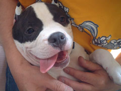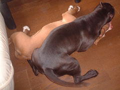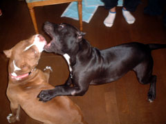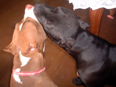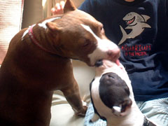 とても立派な体格・・・。 さすが男の子です。みいより4kgも大きいんです。 ディックくん家にはもう1匹レイク君がいます。 まだおちびピットなんですが、みいよりよく食べて元気いっぱいでした。 元気いっぱいでした。 兄弟に会えるなんて、みいは幸せ者ですね〜。 |